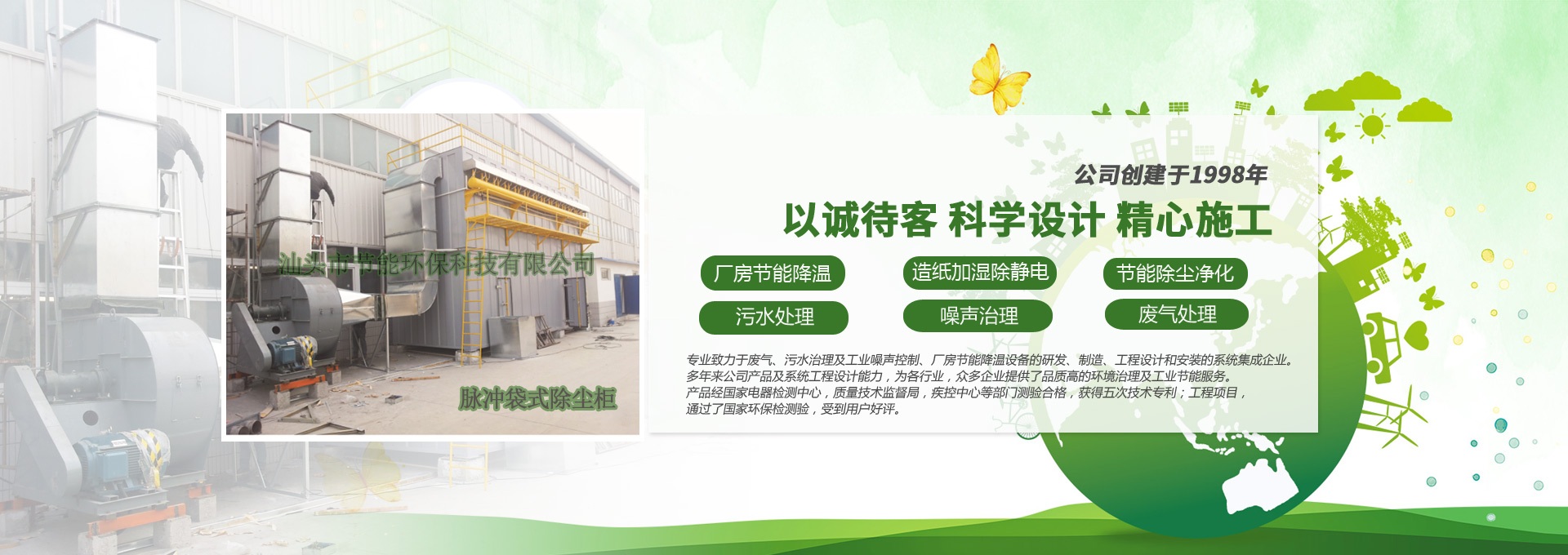 汕頭市節(jié)能環(huán)保科技有限公司創(chuàng)建于1998年,是一家專業致力于廢氣、污水、粉塵、噪聲治理,廠房節(jié)能降溫設備的研發(fā)、制造、工程設計和安裝的系統集成企業。多年來公司產品及系統工程設計能力,為各行業,眾多企業提供了品質高的環(huán)境治理及工業節(jié)能服務。產品經國家電器檢測中心,質量技術監(jiān)督局,疾控中心等部門測驗合格,獲得五次技術專利;工程項目通過了國家環(huán)保檢驗檢測,受到用戶好評。